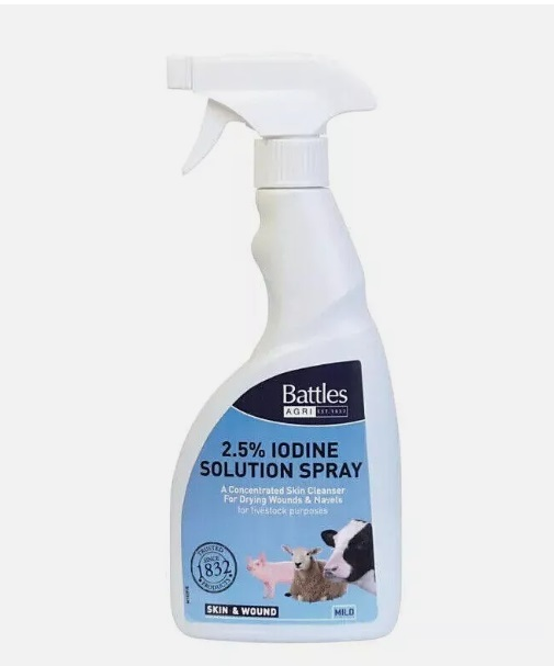 Battles 2.5% Iodine antiseptic spray is a mild general purpose skin disinfectant for use in the management of livestock including horses, sheep, goats, pigs, cattle and birds. Iodine Spray is suitable for treating all minor wounds and can also be used to discourage feather pecking in poultry.